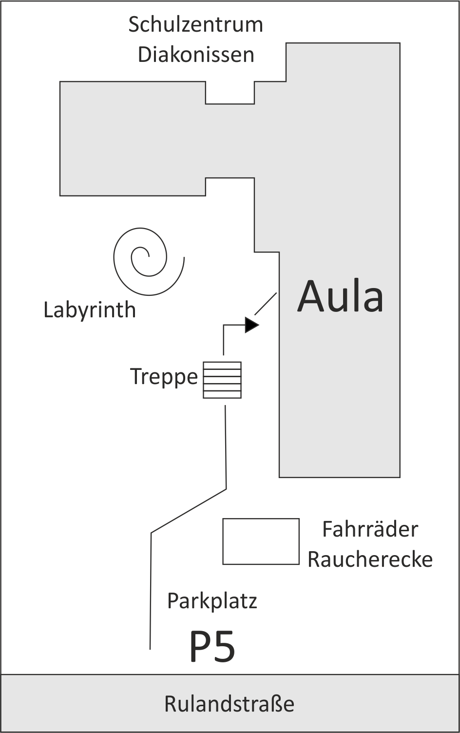 Zugang von der Rulandstraße aus: am Parkplatz P5 auf das Krankenhausgelände gehen, immer geradeaus und ein wenig rechts halten, einige Stufen hinunter zum Eingang. Achtung: nicht auf P5 parken, das ist ein Mitarbeiter-Parkplatz (siehe Beschilderung vor Ort).