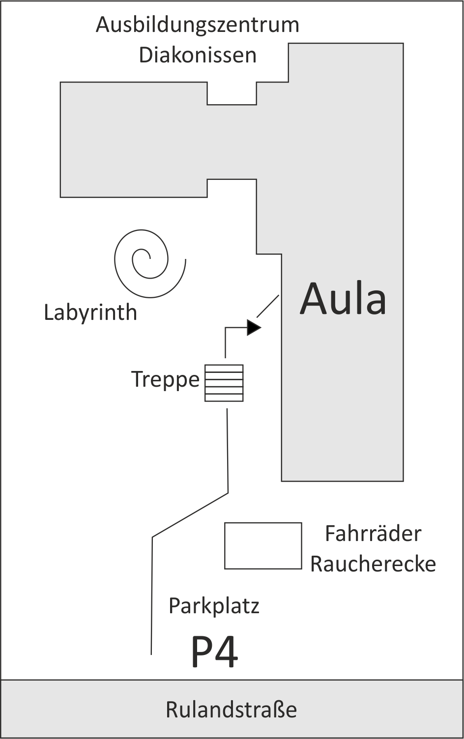 Zugang von der Rulandstraße aus: am Parkplatz P4 auf das Krankenhausgelände gehen, immer geradeaus und ein wenig rechts halten, einige Stufen hinunter zum Eingang.